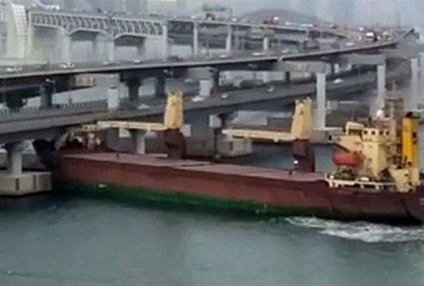 The Korean Coast Guard said the nearly 6,000-ton cargo ship caused about a 15-foot hole in the lower portion of the Gwangan Bridge.