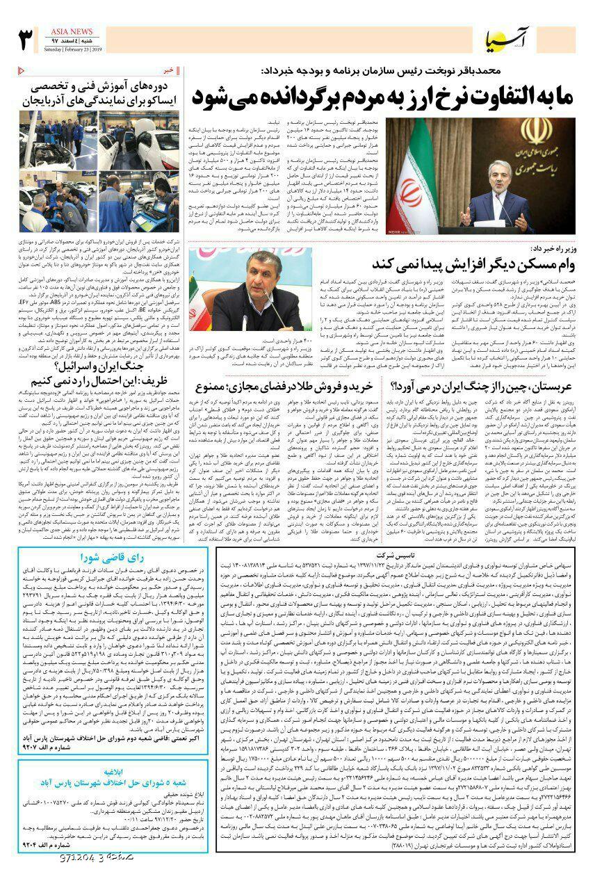روزنامه اقتصادی آسیا - 04 اسفند 1397 ۴ اسفند ۱۳۹۷ https://www.asianewsiran.com/u/cd7 آسیانیوز ایران هیچگونه مسولیتی در قبال نظرات کاربران ندارد. میانگین امتیاز کاربران: 0.0 (0 رای) 12345 امتیاز 12345 برای امتیاز باید عدد وارد کنید ایمیل را وارد کنید ایمیل صحیح نیست ایمیل نمایش داده شود. تعداد کاراکتر باقیمانده: 1000 نظر خود را وارد کنید بازخوانی بازخوانی پس از انتشار این نظر، به من اطلاع داده شود. ارسال توجه : نظرات بیان شده در یادداشتهایی که منتشر میکنیم، بیانگر عقیده نگارنده آن است و لزوماً دیدگاه مدیران وبسایت آسیانیوز و آسیانیوز ایران نمیباشد. سردبیر
