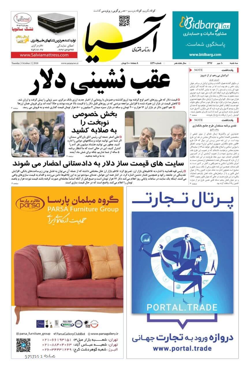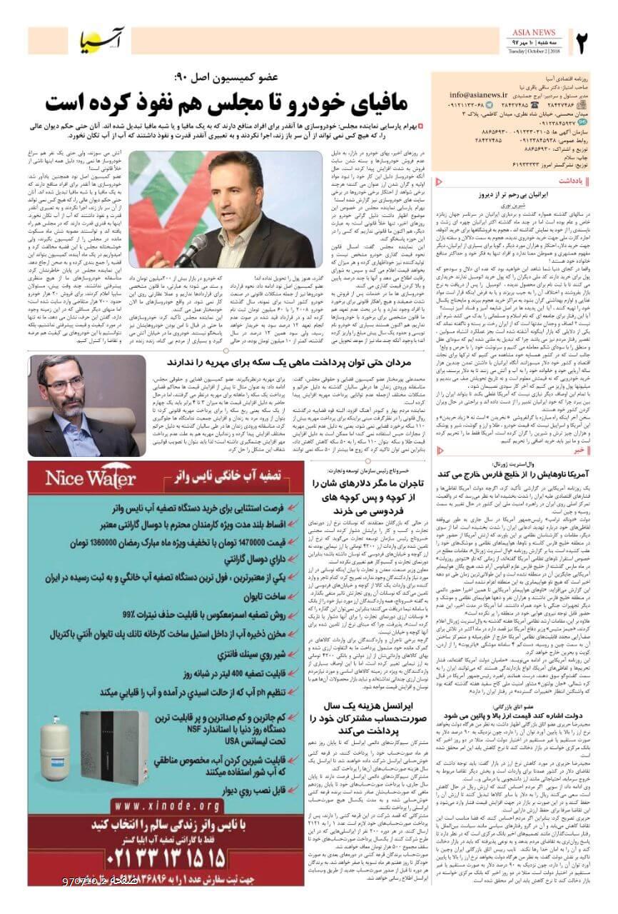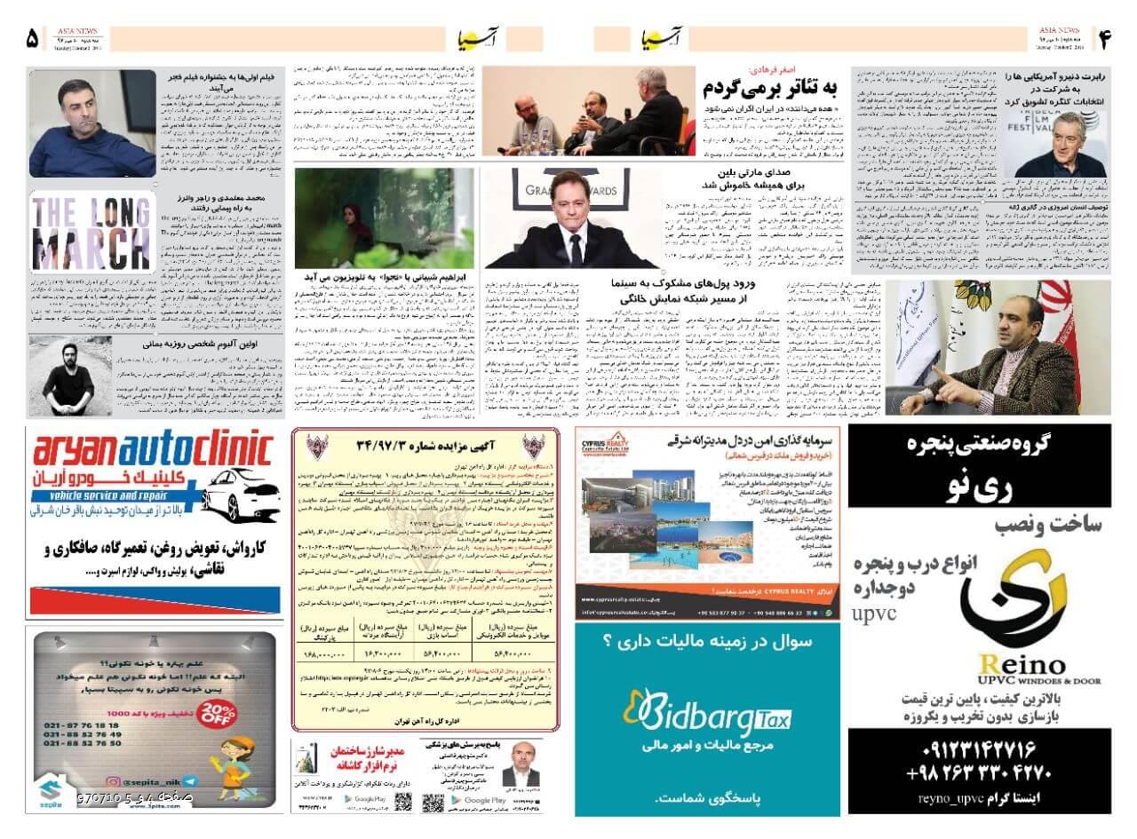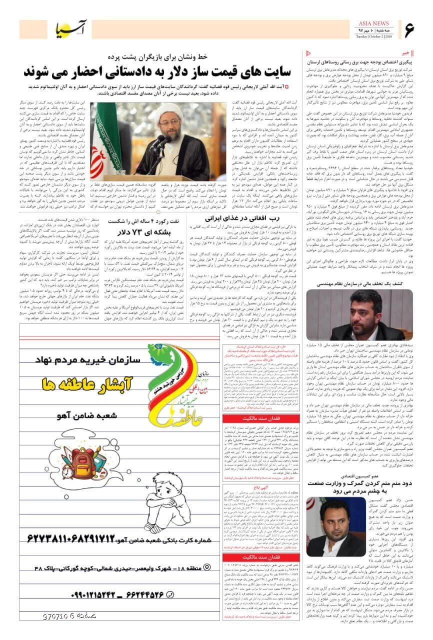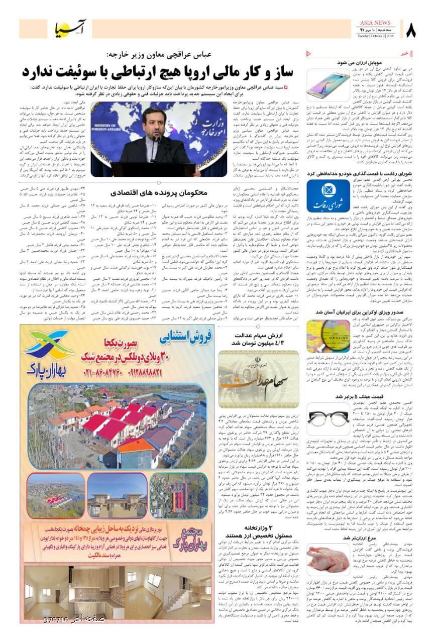 روزنامه اقتصادی آسیا - 10 مهر1397 ۱۰ مهر ۱۳۹۷ https://www.asianewsiran.com/u/cc0 آسیانیوز ایران هیچگونه مسولیتی در قبال نظرات کاربران ندارد. میانگین امتیاز کاربران: 0.0 (0 رای) 12345 امتیاز 12345 برای امتیاز باید عدد وارد کنید ایمیل را وارد کنید ایمیل صحیح نیست ایمیل نمایش داده شود. تعداد کاراکتر باقیمانده: 1000 نظر خود را وارد کنید بازخوانی بازخوانی پس از انتشار این نظر، به من اطلاع داده شود. ارسال توجه : نظرات بیان شده در یادداشتهایی که منتشر میکنیم، بیانگر عقیده نگارنده آن است و لزوماً دیدگاه مدیران وبسایت آسیانیوز و آسیانیوز ایران نمیباشد. سردبیر