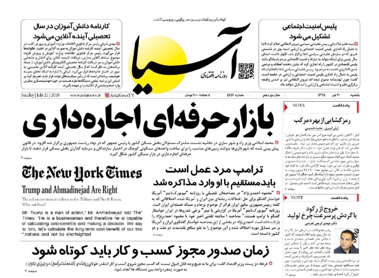 روزنامه اقتصادی آسیا- 30 تیر 1398