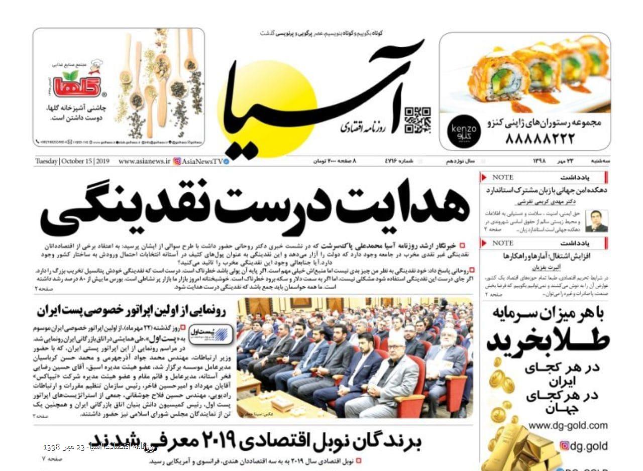 روزنامه اقتصادی آسیا- 23 مهر 1398