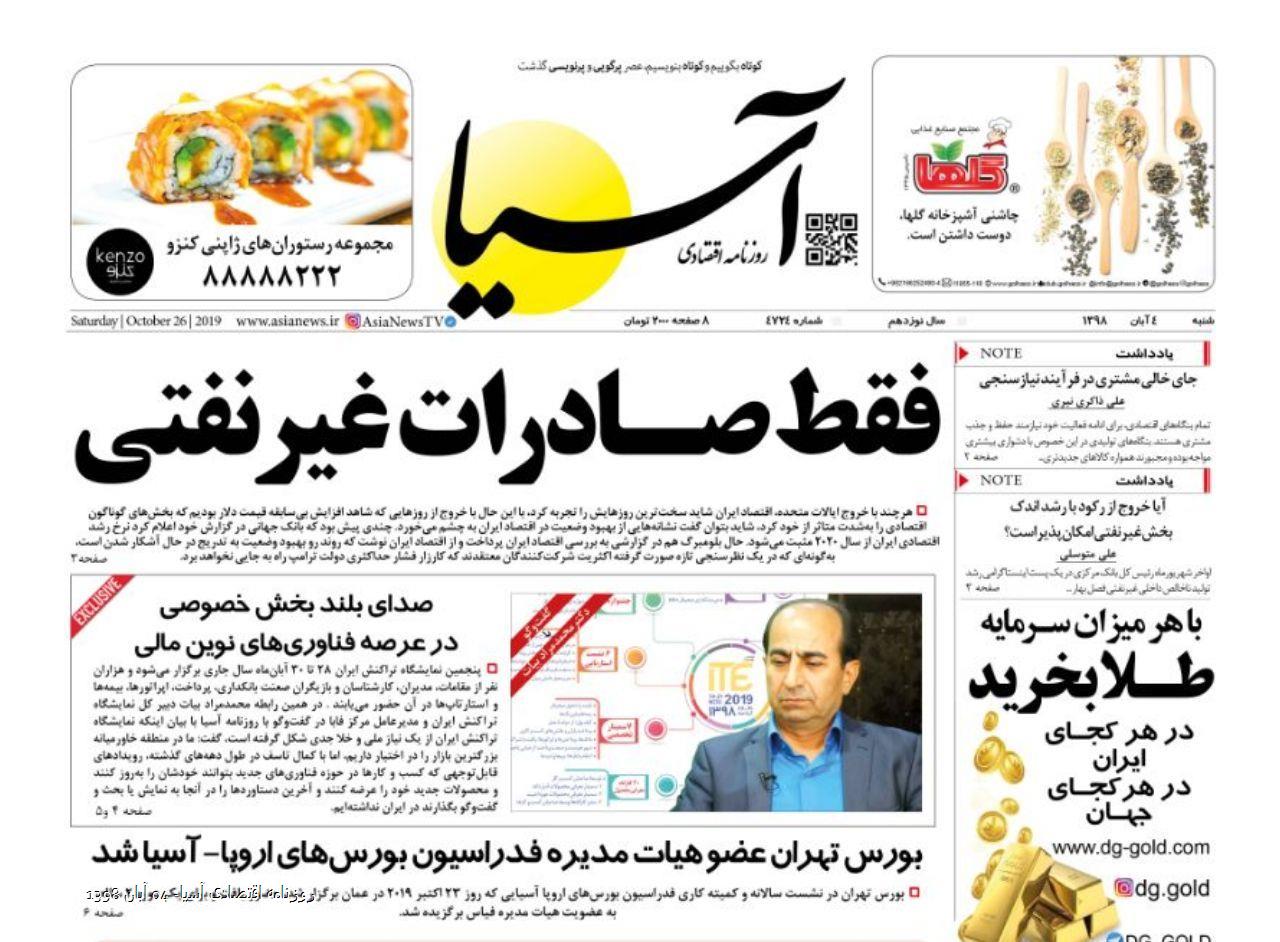 روزنامه اقتصادی آسیا- 04 آبان 1398 ۳ آبان ۱۳۹۸ https://www.asianewsiran.com/u/cmm آسیانیوز ایران هیچگونه مسولیتی در قبال نظرات کاربران ندارد. میانگین امتیاز کاربران: 0.0 (0 رای) 12345 امتیاز 12345 برای امتیاز باید عدد وارد کنید ایمیل را وارد کنید ایمیل صحیح نیست ایمیل نمایش داده شود. تعداد کاراکتر باقیمانده: 1000 نظر خود را وارد کنید بازخوانی بازخوانی پس از انتشار این نظر، به من اطلاع داده شود. ارسال توجه : نظرات بیان شده در یادداشتهایی که منتشر میکنیم، بیانگر عقیده نگارنده آن است و لزوماً دیدگاه مدیران وبسایت آسیانیوز و آسیانیوز ایران نمیباشد. سردبیر