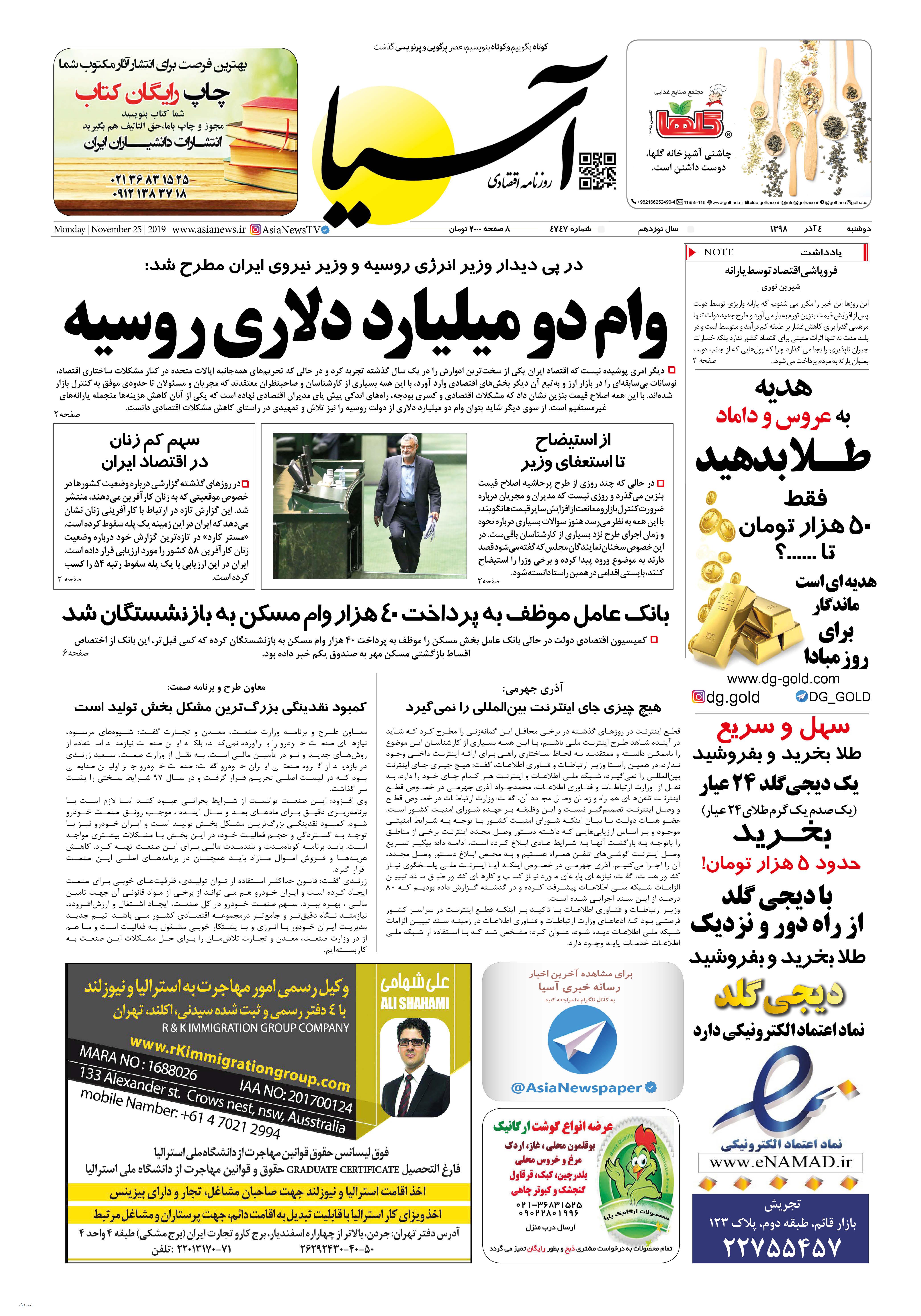 روزنامه اقتصادی آسیا- 04 آذر 1398 ۳ آذر ۱۳۹۸ https://www.asianewsiran.com/u/cdg آسیانیوز ایران هیچگونه مسولیتی در قبال نظرات کاربران ندارد. میانگین امتیاز کاربران: 0.0 (0 رای) 12345 امتیاز 12345 برای امتیاز باید عدد وارد کنید ایمیل را وارد کنید ایمیل صحیح نیست ایمیل نمایش داده شود. تعداد کاراکتر باقیمانده: 1000 نظر خود را وارد کنید بازخوانی بازخوانی پس از انتشار این نظر، به من اطلاع داده شود. ارسال توجه : نظرات بیان شده در یادداشتهایی که منتشر میکنیم، بیانگر عقیده نگارنده آن است و لزوماً دیدگاه مدیران وبسایت آسیانیوز و آسیانیوز ایران نمیباشد. سردبیر