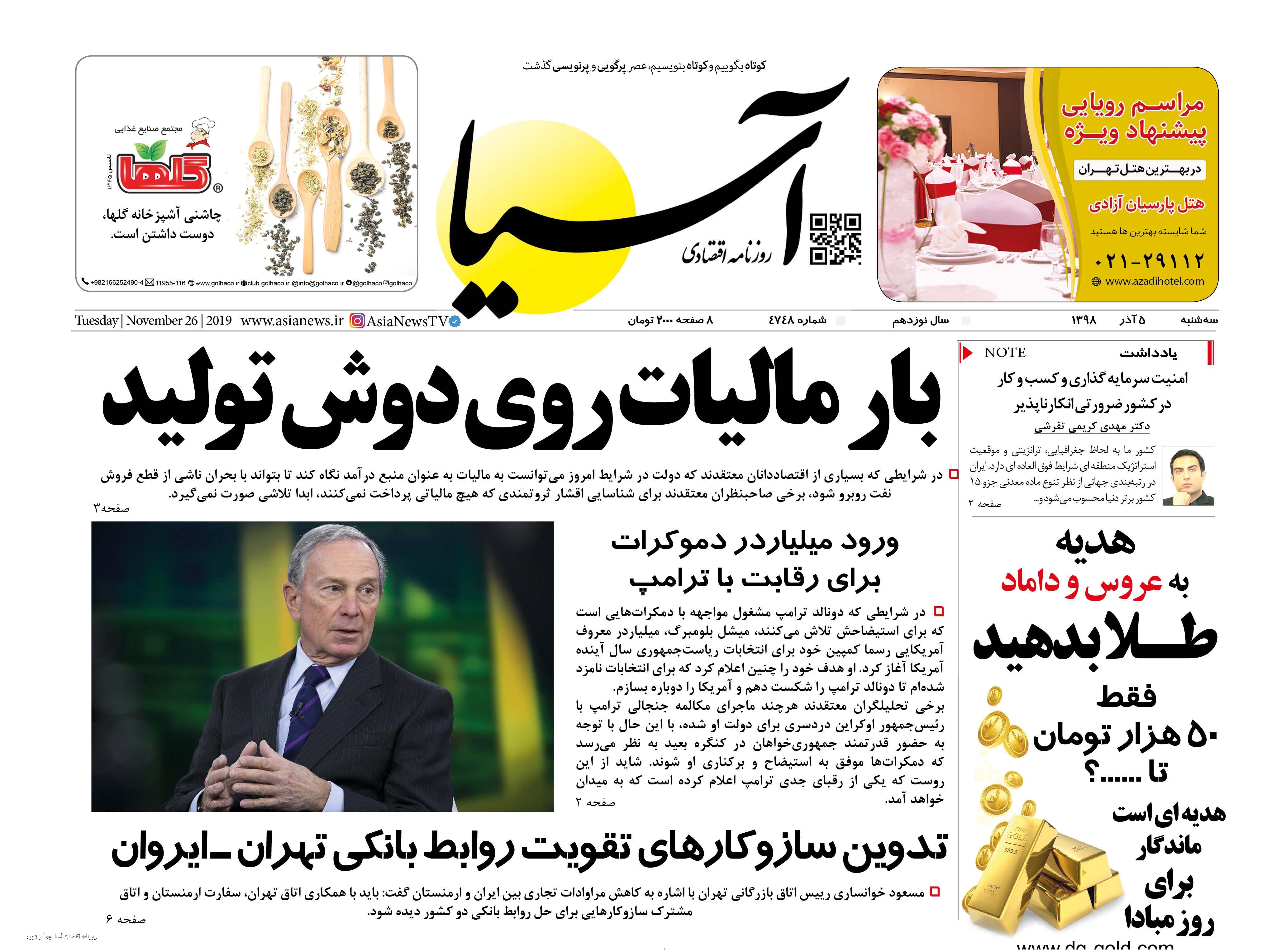 روزنامه اقتصادی آسیا- 05 آذر 1398 ۴ آذر ۱۳۹۸ https://www.asianewsiran.com/u/cq6 آسیانیوز ایران هیچگونه مسولیتی در قبال نظرات کاربران ندارد. میانگین امتیاز کاربران: 0.0 (0 رای) 12345 امتیاز 12345 برای امتیاز باید عدد وارد کنید ایمیل را وارد کنید ایمیل صحیح نیست ایمیل نمایش داده شود. تعداد کاراکتر باقیمانده: 1000 نظر خود را وارد کنید بازخوانی بازخوانی پس از انتشار این نظر، به من اطلاع داده شود. ارسال توجه : نظرات بیان شده در یادداشتهایی که منتشر میکنیم، بیانگر عقیده نگارنده آن است و لزوماً دیدگاه مدیران وبسایت آسیانیوز و آسیانیوز ایران نمیباشد. سردبیر