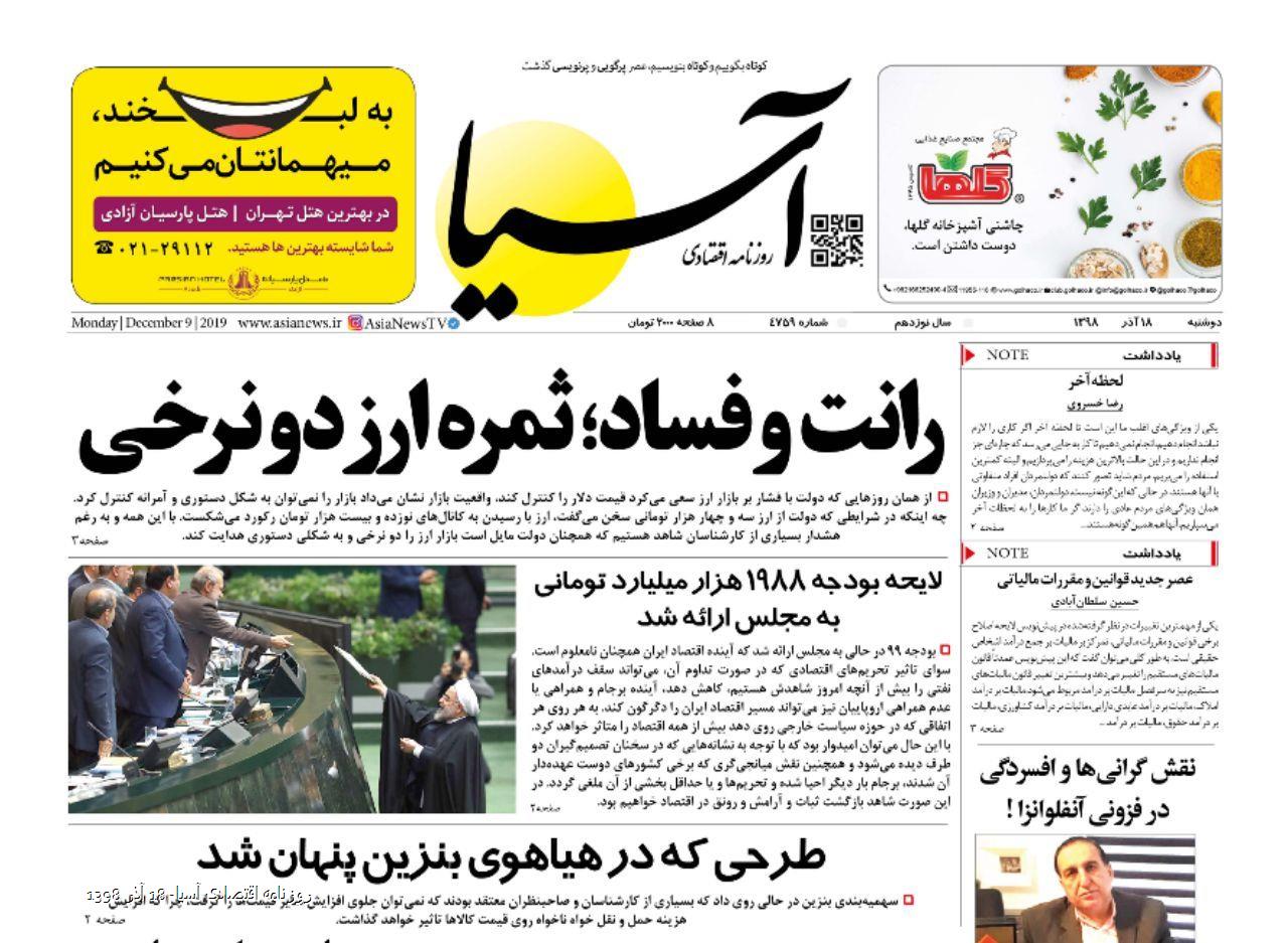 روزنامه اقتصادی آسیا- 18 آذر 1398