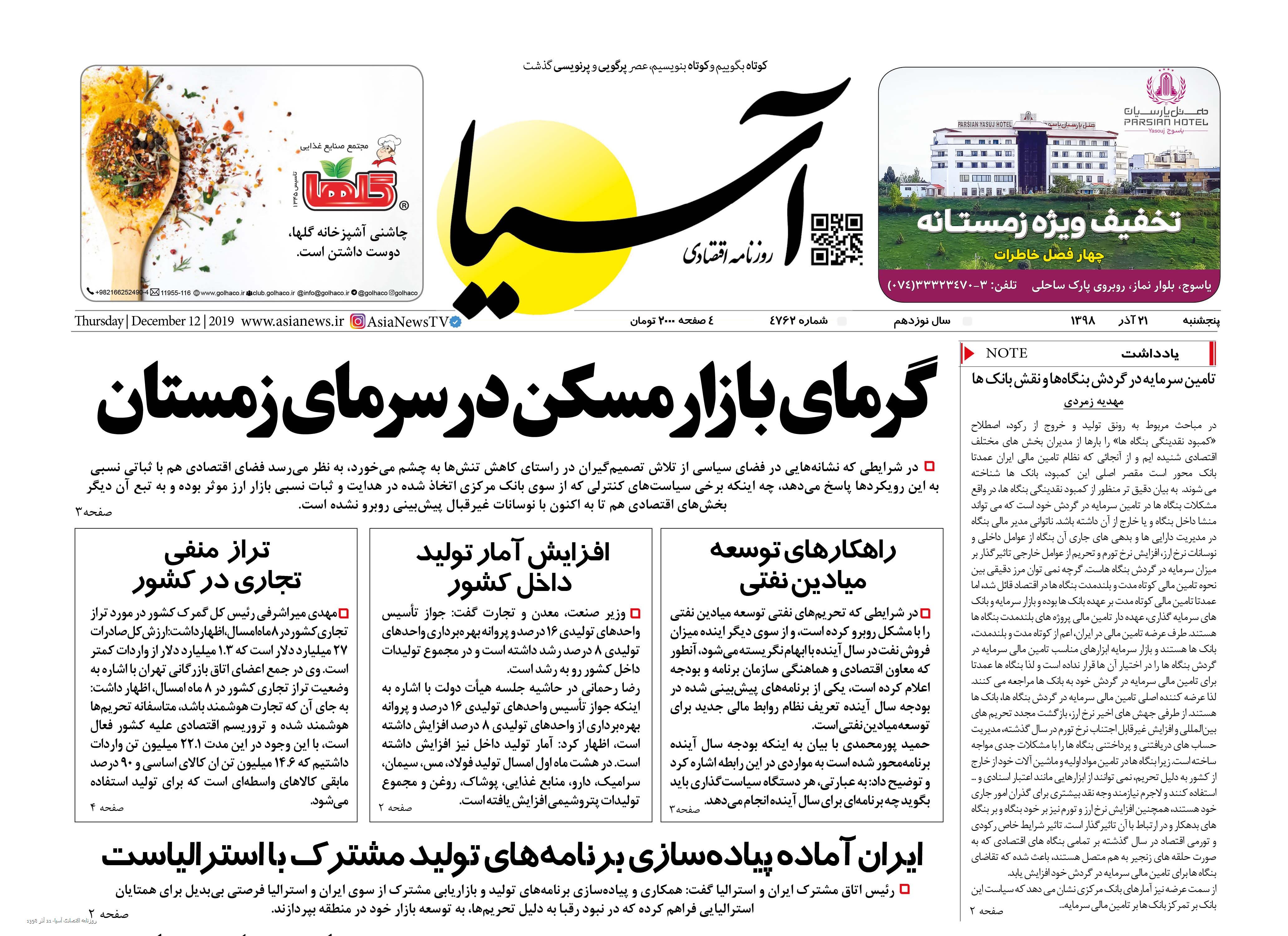 روزنامه اقتصادی آسیا- 21 آذر 1398 ۲۰ آذر ۱۳۹۸ https://www.asianewsiran.com/u/c58 آسیانیوز ایران هیچگونه مسولیتی در قبال نظرات کاربران ندارد. میانگین امتیاز کاربران: 0.0 (0 رای) 12345 امتیاز 12345 برای امتیاز باید عدد وارد کنید ایمیل را وارد کنید ایمیل صحیح نیست ایمیل نمایش داده شود. تعداد کاراکتر باقیمانده: 1000 نظر خود را وارد کنید بازخوانی بازخوانی پس از انتشار این نظر، به من اطلاع داده شود. ارسال توجه : نظرات بیان شده در یادداشتهایی که منتشر میکنیم، بیانگر عقیده نگارنده آن است و لزوماً دیدگاه مدیران وبسایت آسیانیوز و آسیانیوز ایران نمیباشد. سردبیر