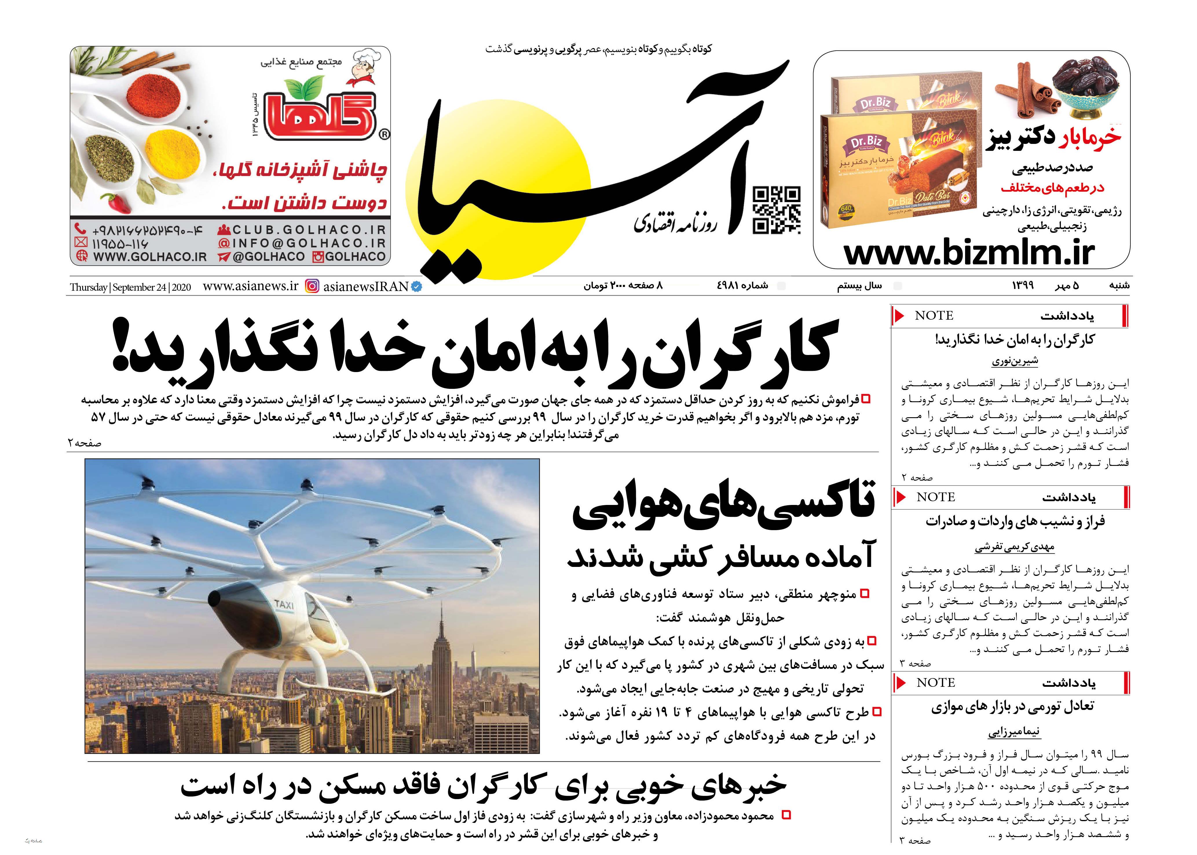 روزنامه اقتصادی آسیا- 5 مهر 1399