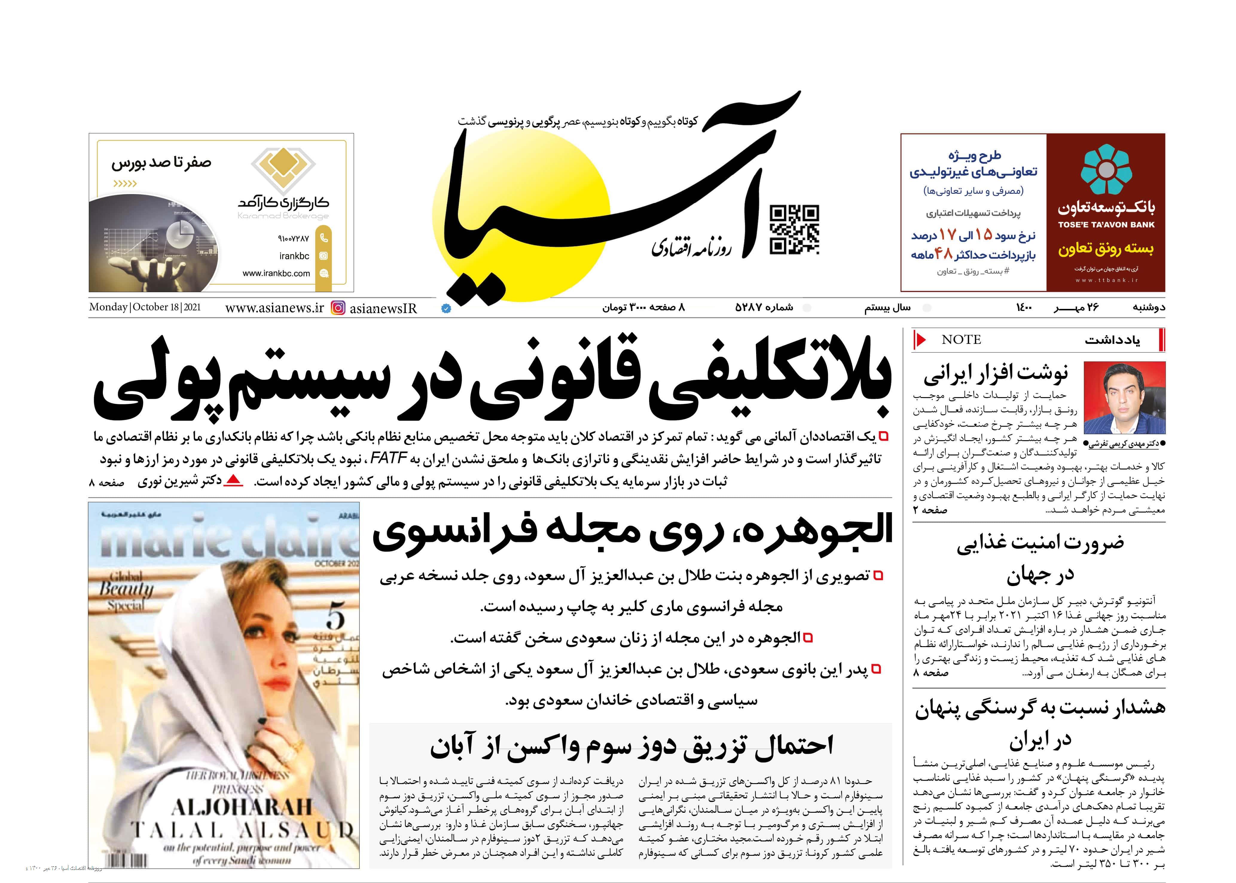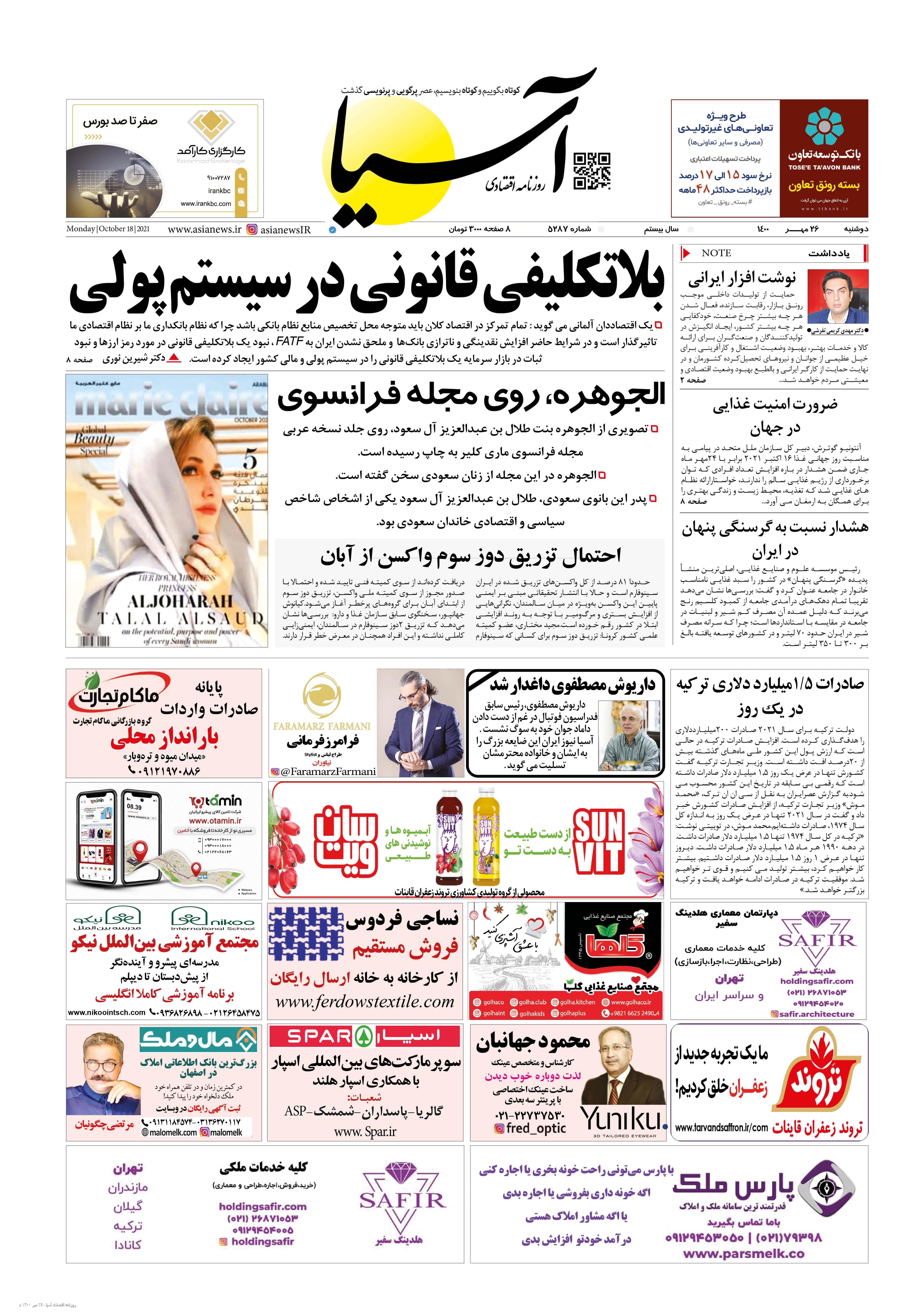 روزنامه اقتصادی آسیا - ۲۶ مهر ۱۴۰۰ ۲۶ مهر ۱۴۰۰ https://www.asianewsiran.com/u/bos آسیانیوز ایران هیچگونه مسولیتی در قبال نظرات کاربران ندارد. میانگین امتیاز کاربران: 0.0 (0 رای) 12345 امتیاز 12345 برای امتیاز باید عدد وارد کنید ایمیل را وارد کنید ایمیل صحیح نیست ایمیل نمایش داده شود. تعداد کاراکتر باقیمانده: 1000 نظر خود را وارد کنید بازخوانی بازخوانی پس از انتشار این نظر، به من اطلاع داده شود. ارسال توجه : نظرات بیان شده در یادداشتهایی که منتشر میکنیم، بیانگر عقیده نگارنده آن است و لزوماً دیدگاه مدیران وبسایت آسیانیوز و آسیانیوز ایران نمیباشد. سردبیر