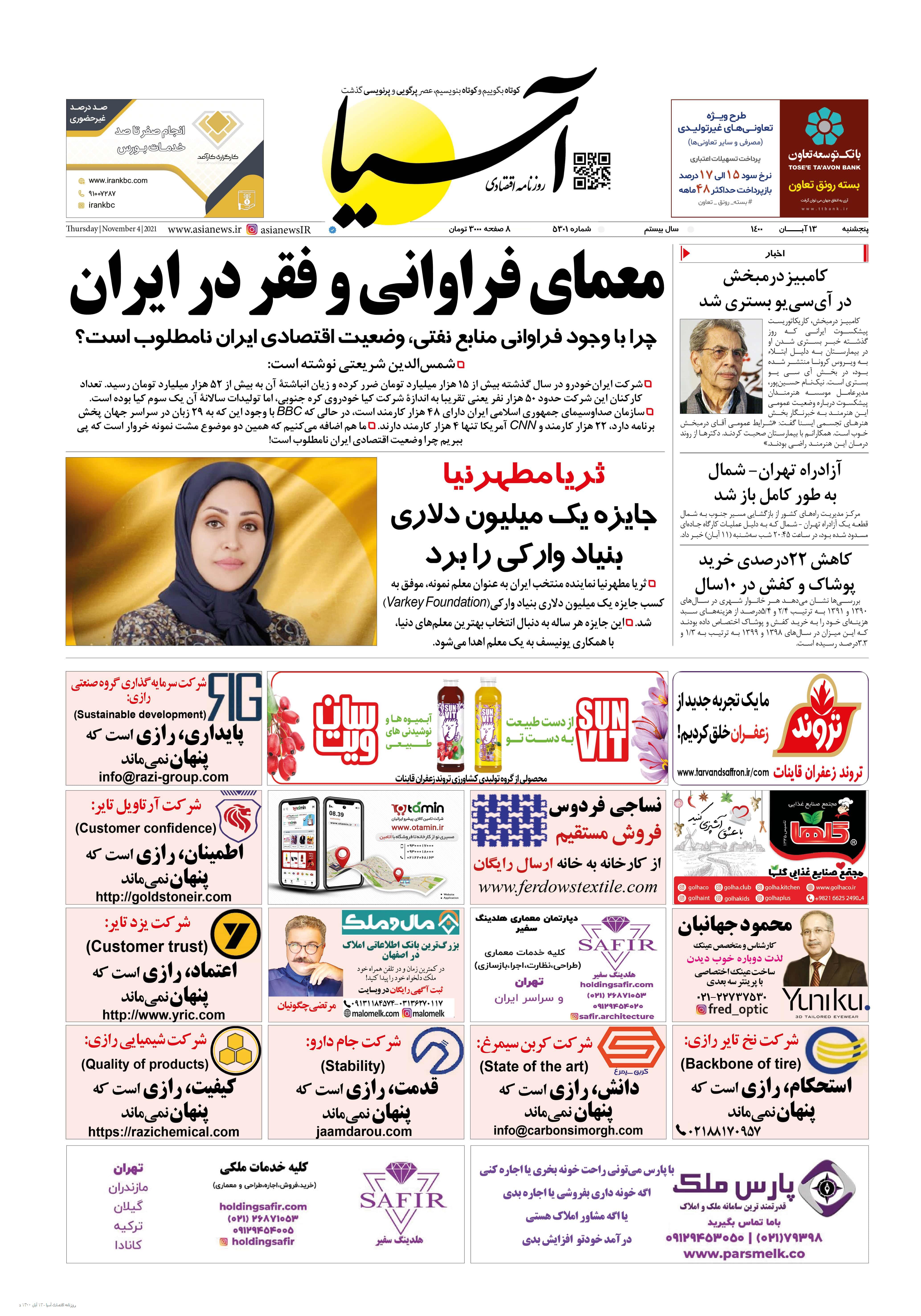 روزنامه اقتصادی آسیا - ۱۳ آبان ۱۴۰۰