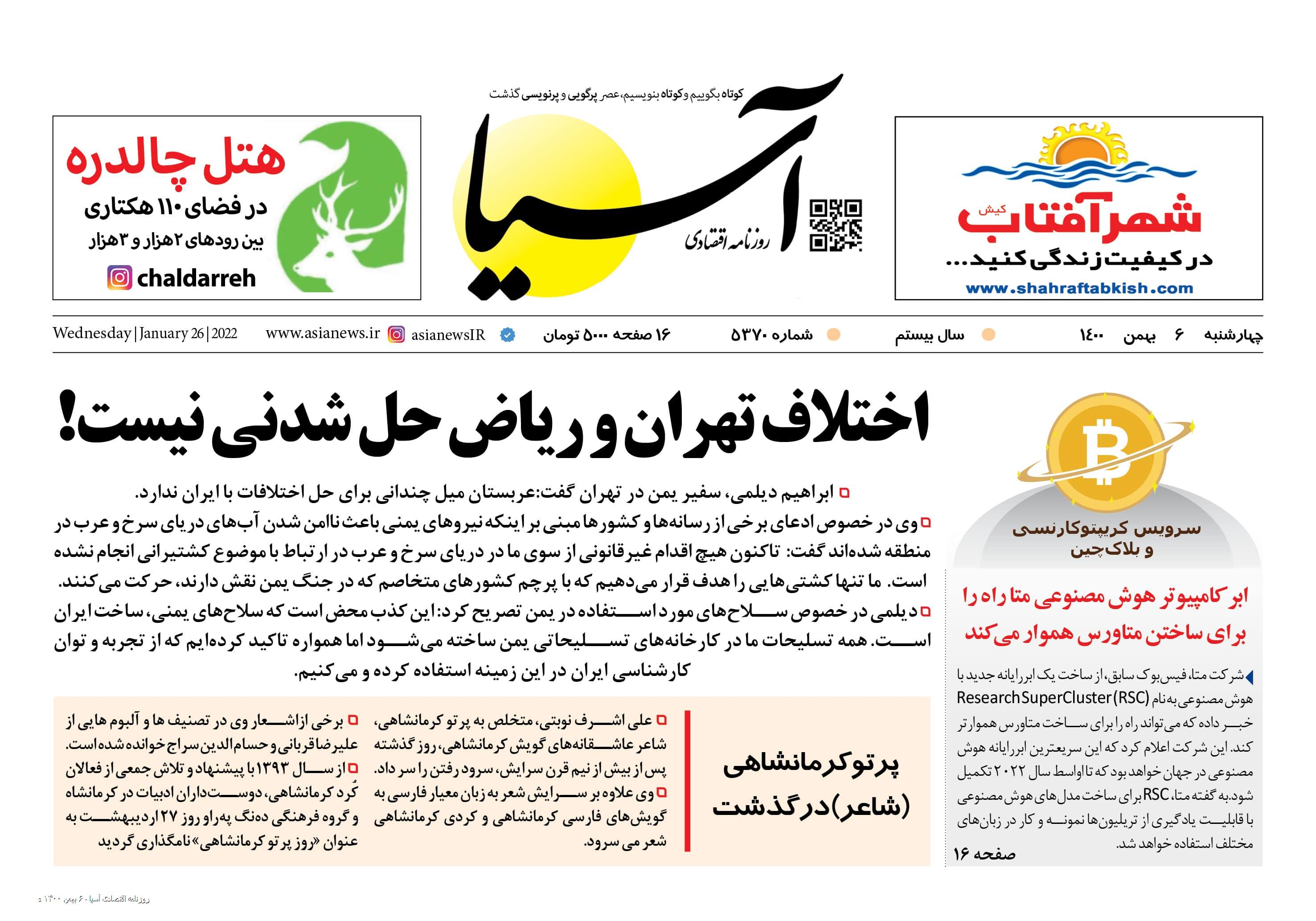 روزنامه اقتصادی آسیا - ۶ بهمن ۱۴۰۰
