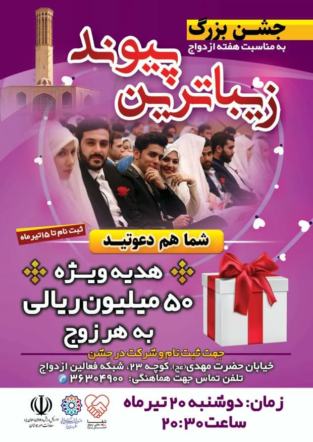 جشن بزرگ زیباترین پیوند به همت سازمان فرهنگی اجتماعی ورزشی شهرداری یزد، اداره کل ورزش و جوانان استان یزد و شبکه فعالین ازدواج شفا استان یزد برگزار میگردد.
