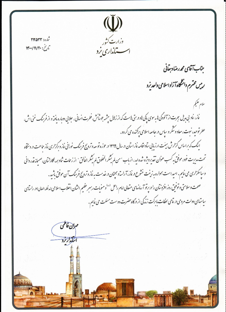 بر اساس این گزارش ، دانشگاه آزاد اسلامی واحد یزد، شایسته تقدیر گردیده و به پاس این زحمات موفق ، دکتر محمد رضا دهقانی اشکذری ، رئیس این واحد دانشگاهی به دریافت لوح تقدیر از طرف استانداری و ستاد اقامه نماز استان یزد شد.