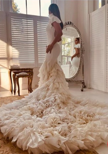 عروس با پیراهن سفید خیرهکنندهاش از رالف لارن، به محراب ازدواج پا گذاشت. آستینهای لباس کوتاه بود و پشت آن برشخورده، و چینهای اریبی که از روی دامن شروع میشد، به یک دنباله بسیار بلند منتهی میشد.