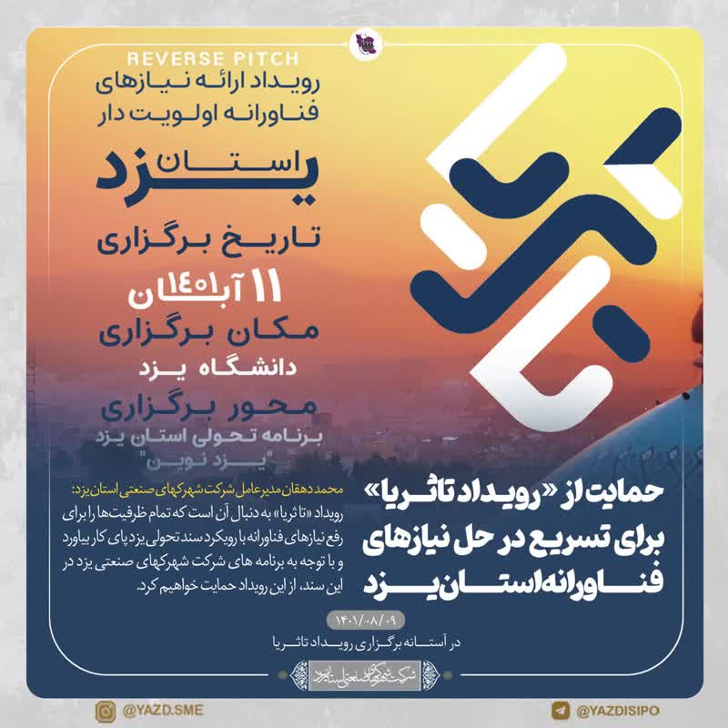 وی با اشاره به برگزاری این رویداد در آبان ماه سال جاری عنوان کرد: تا ثریا می تواند به تکمیل زنجیره سرمایه گذاری استان در حوزه فناوری های نو کمک کند و با توجه به اهمیت موضوع و برای شتاب توسعه استان بر اساس سند یزدنوین، از سرمایه گذارانی که علاقه مند به سرمایه گذاری در استان یزد هستند دعوت میکنم در این رویداد نقش آفرین باشند.