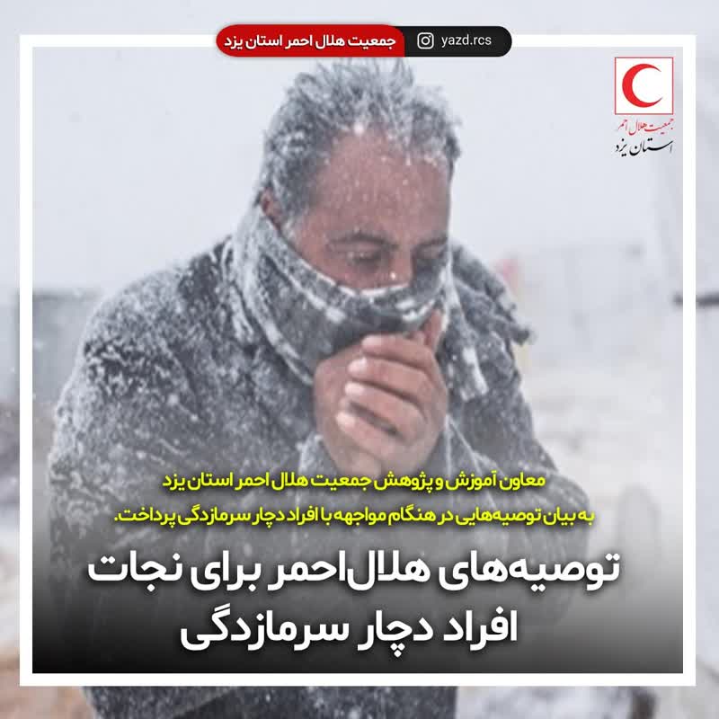 آسیانیوز / یزد ؛ سید محمد دریایی معاون آموزش و پژوهش جمعیت هلال احمر استان یزد گفت: توصیه هلال احمر در هنگام مواجهه با فردی که دچار سرمازدگی شده است در صورت تشخیص و نیاز با اورژانس تماس بگیرید.