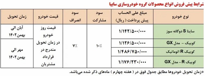 در این مرحله از طرح پیش فروش سایپا؛ ساینا s، کوییک مدل GX، کوییک R اتوماتیک و کوییک R مدلGX عرضه میشود. بر اساس جدول بالا، قیمت خودرو در این طرح مطابق با قیمت روز خودرو حساب حساب میشود.