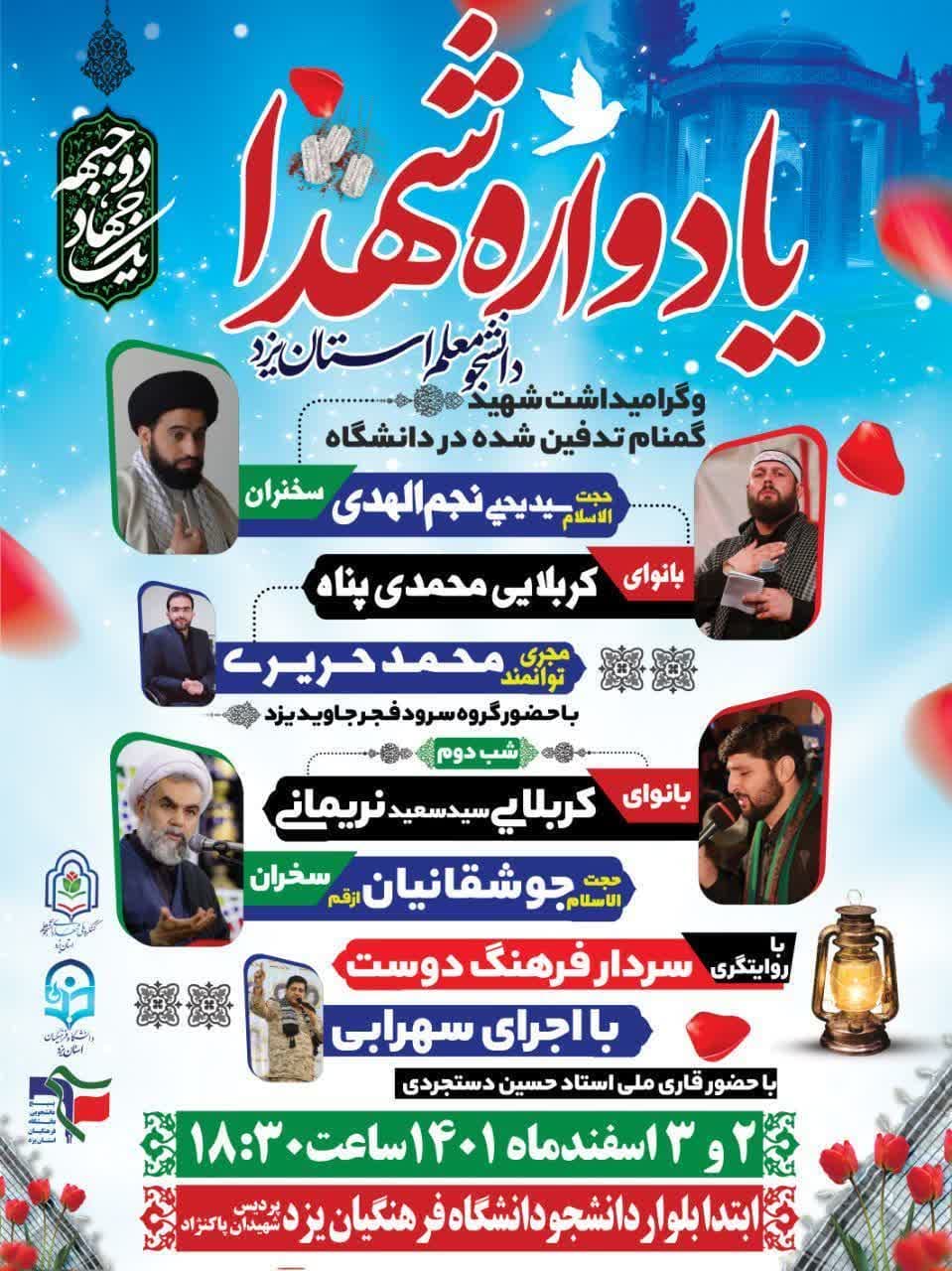 آسیانیوز / یزد ؛ این مراسم دوم و سوم اسفند ساعت ١٨:٣٠ با سخنرانی حجت الاسلام «سید یحیی نجم الهدی» و «جوشقیان»، مداحی «محمدی پناه» و «نریمانی» همراه با روایتگری سردار «فرهنگدوست» با حضور قاری ملی «حسین دستجری» در پردیس شهیدان پاکنژاد دانشگاه فرهنگیان یزد برگزار خواهد شد.