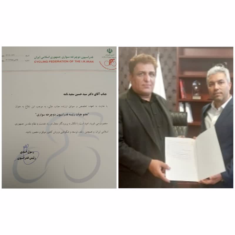 آسیانیوز / یزد ؛ طی حکمی از سوی رییس فدراسیون دوچرخه سواری کشور سید حسین سعیدنامه بعنوان عضو هیات رییسه فدراسیون دوچرخه سواری کشور منصوب شد.
