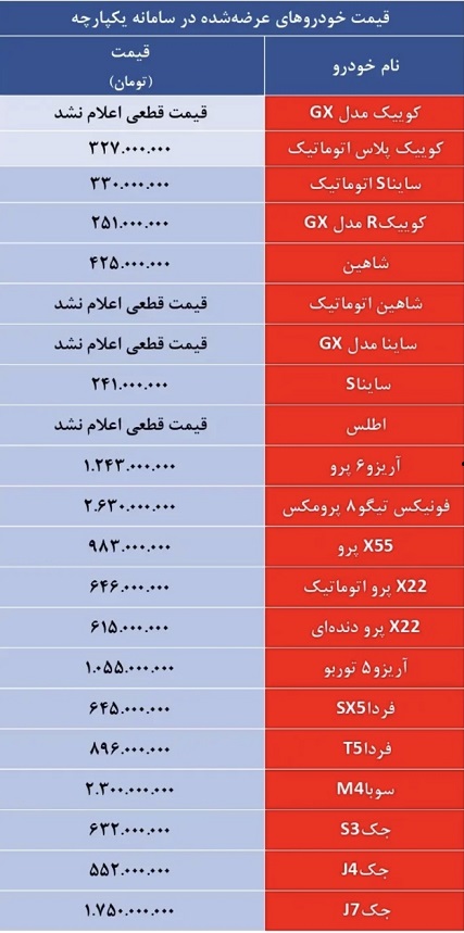لیست خودروهای عرضه شده در سامانه یکپارچه