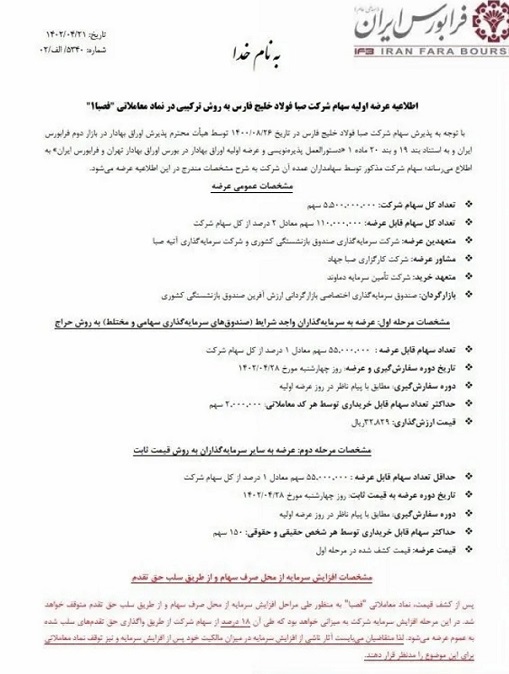 عرضه اولیه سهام شرکت صبا فولاد خلیج‌فارس به روش ترکیبی در نماد معاملاتی #فصبا