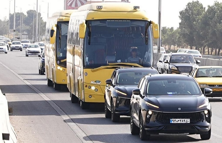 اتوبوس باشگاه النصر در مسیر حرکت به سمت فرودگاه امام برای انتقال اعضای این باشگاه - برای رفت و امد باشگاه النصر دو دستگاه اتوبوس به رنگ و لوگوی باشگاه تدارک دیده شده است.