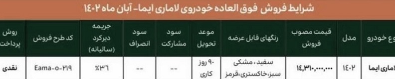 به نوشته تسنیم، شرایط فروش لاماری‌ایما به صورت پرداخت با قیمت مصوب معادل یک میلیارد و 431 میلیون تومان و موعد تحویل 90 روز کاری است. رنگ‌های قابل عرضه لاماری‌ایما در این طرح سفید، مشکی، سبز، خاکستری و قرمز خواهد بود./