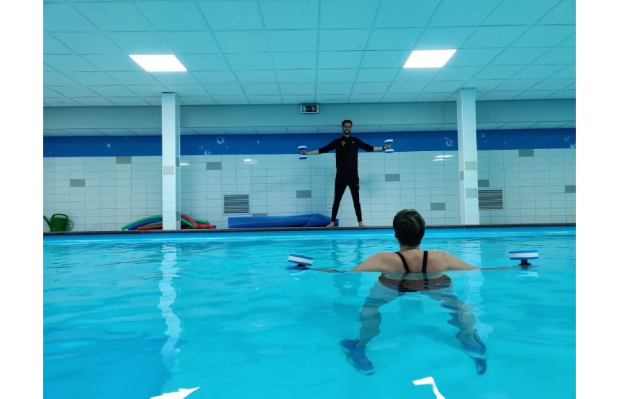 - بالا بردن ران در آب هم خود یکی دیگر از تمرینات آب درمانی برای مشکلات زانو است. تا کمر در آب بایستید و سعی کنید دیواره استخر دقیقاً در سمت راست بدن شما باشد. حال باید پای چپ را به پهلو کشیده و سپس زانوی خود را صاف نگه دارید. مجدد به موقعیت اصلی بر می گردید با پای چپ پشت پا بزنید و مجدد به موقعیت برگردید و حال باید بدن خود را بچرخانید سمت چپ بدن خود را به سمت دیواره استخر برای حرکات موقعیت چپ بدن به همین شکل امتحان کنید.