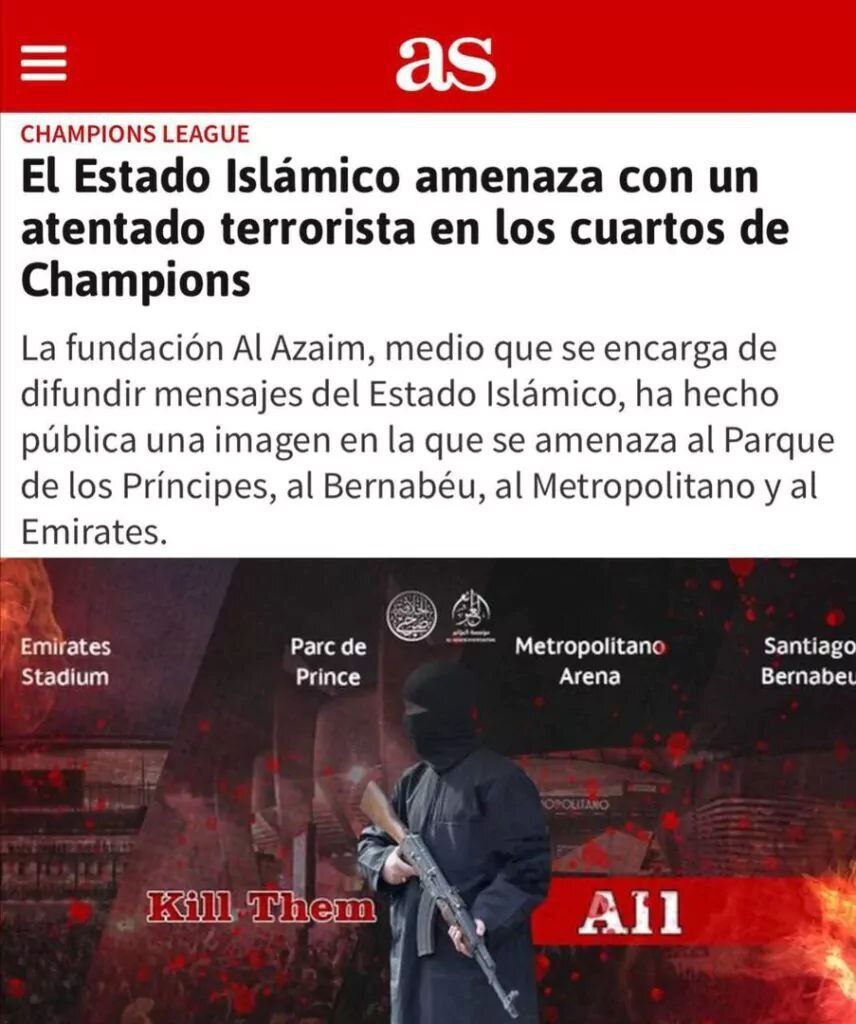 وبگاه اسپانیایی «اوندا سِرو» گزارش داد داعش تهدید کرده است که بازیهای مرحله یک چهارم نهایی لیگ قهرمانان اروپا را هدف قرار خواهد داد.
