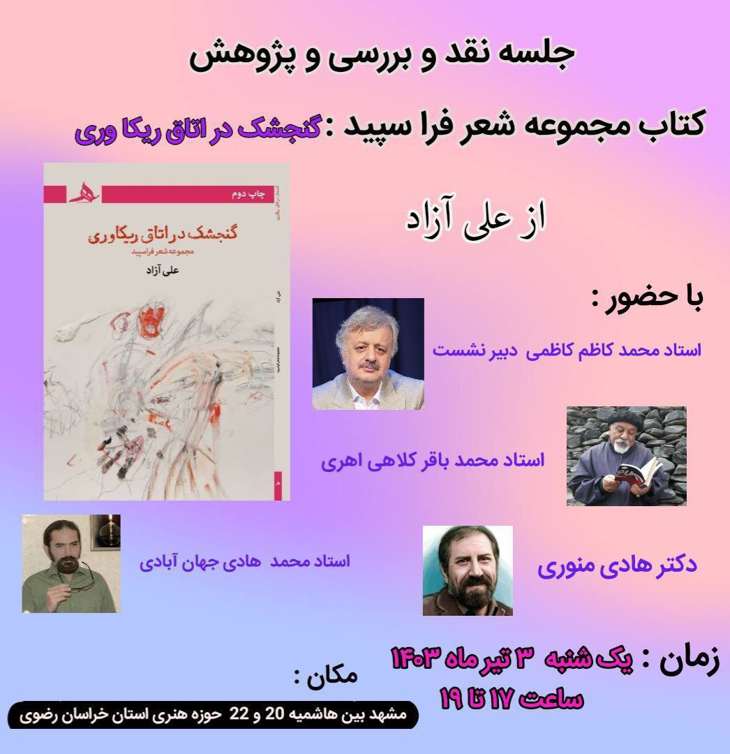 به ‌مناسبت چاپ دوم کتاب گنجشک در اتاق ریکاوری، مجموعه شعر فراسپید علی آزاد نشست نقد و بررسی این کتاب در مشهد برگزار می‌شود.