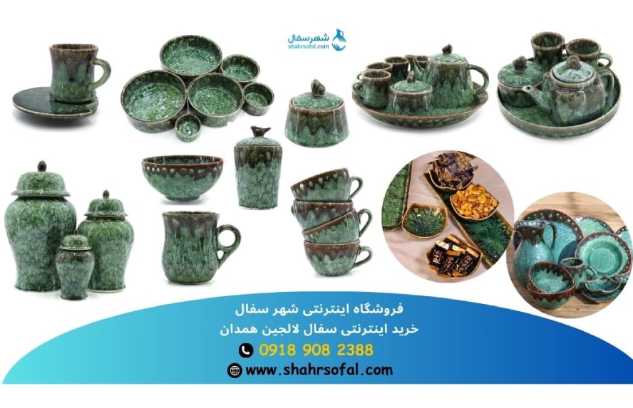 ظروف سفالی در شهر لالجین در دو رنگ سبز و آبی لاجوردی تولید می‌شوند و مانند سایر ظروف اجزای مختلفی دارند که شامل بشقاب پلوخوری، خورشت خوری، پیش‌دستی، پارچ و لیوان، پیاله، سالادخوری، سرویس چایخوری و غیره هستند.