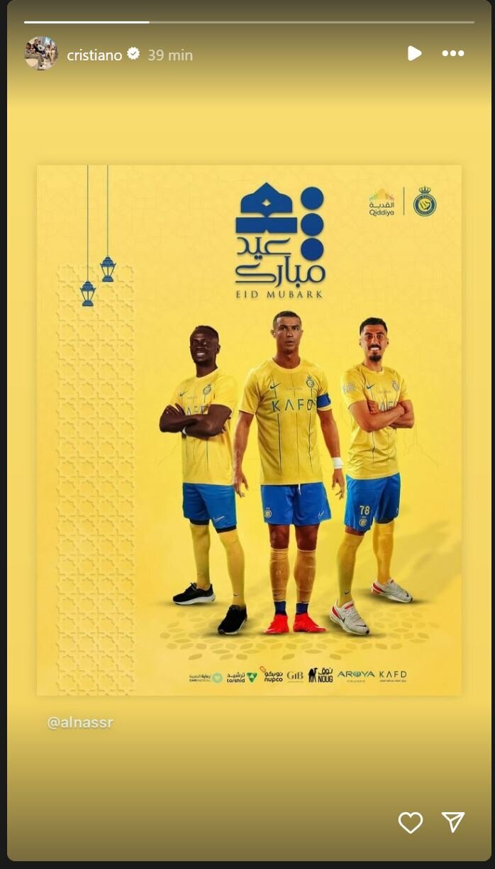 ستاره پرتغالی تیم فوتبال النصر عربستان در شبکه اجتماعی اینستاگرام، عید سعید قربان را تبریک گفت.