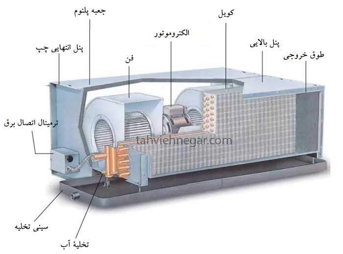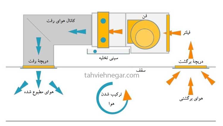 در شکل زیر اجزای یک نوع سیستم دو لوله ای نشان داده شده است. زمانی که دستگاه روشن می شود از طریق دریچه برگشتی، جریان هوا به سمت داخل مکیده می شود و پس از عبور از فیلتر و مبدل حرارتی(که ممکن است کویل در حالت سرمایش یا گرمایش باشد)، جریان هوا وارد کانال شده و سپس از طریق دریچه رفت، به صورت دهش وارد فضای ساختمان می شود. تا زمانی که دستگاه روشن باشد، گردش جریان هوا وجود دارد.