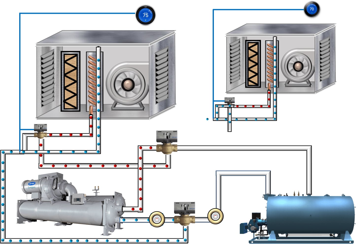 اما گاهی با توجه به نوع کاربری و معماری ساختمان، نیاز به سرمایش و گرمایش همزمان احساس می گردد. در چنین شرایطی از سیستم های چهار لوله ای استفاده می شود که دارای دو لوله ورودی و دو لوله خروجی بوده و از دو کویل جداگانه (به صورت مستقل، یکی جهت سرمایش و دیگری به منظور گرمایش) بهره می برند. لذا، این امکان فراهم می گردد که بنا به نیاز و دلخواه افراد حاضر، در فضایی از ساختمان، سرمایش و در فضایی دیگر، گرمایش ایجاد شود.