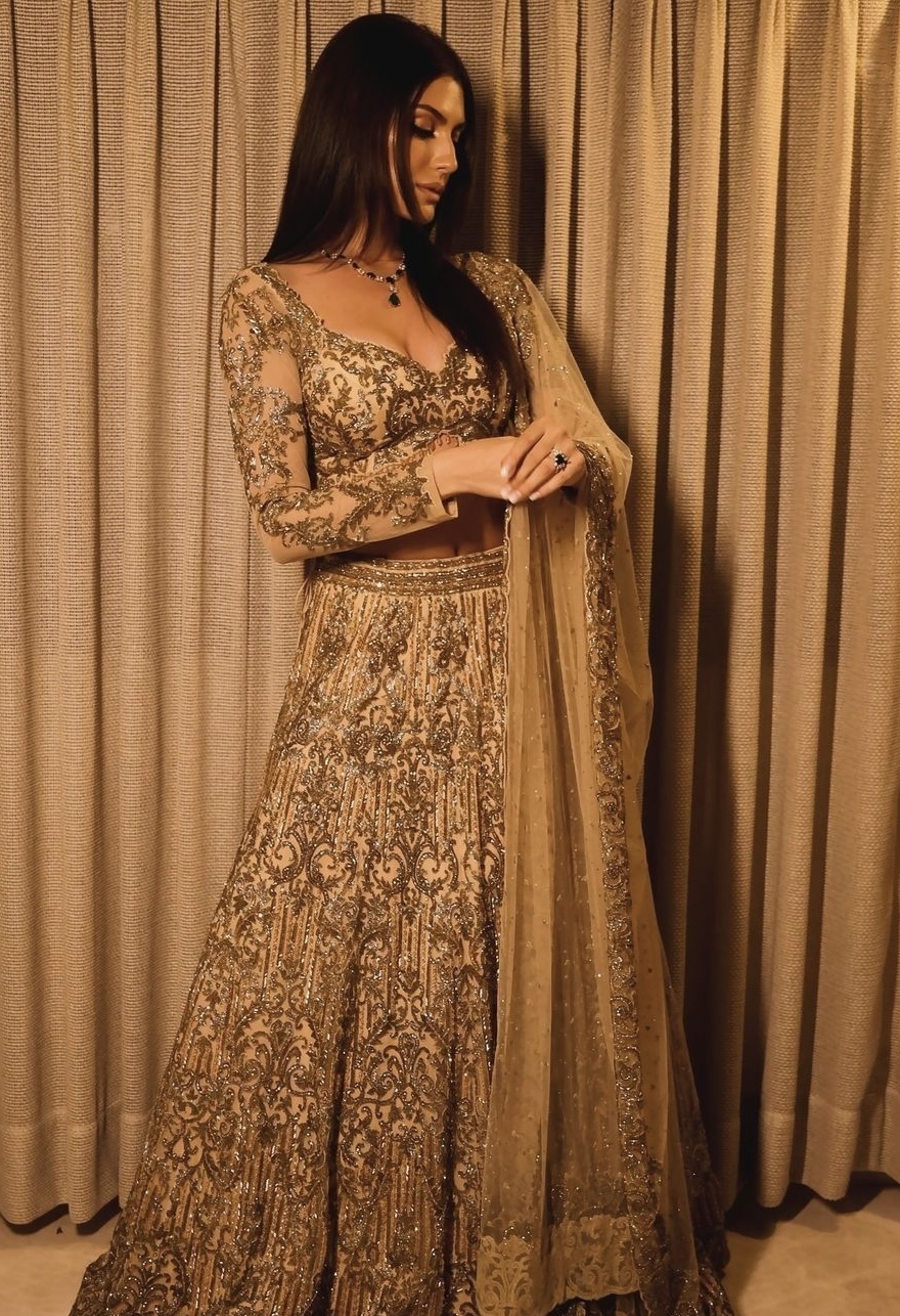 نوروزی یک لباس دوتکه با نیمتنه و دامن طلایی از مزون نیودیتا (NIVEDITA) به تن داشت و آن را با جواهراتی از دارشانا سانجانا تکمیل کرده بود.