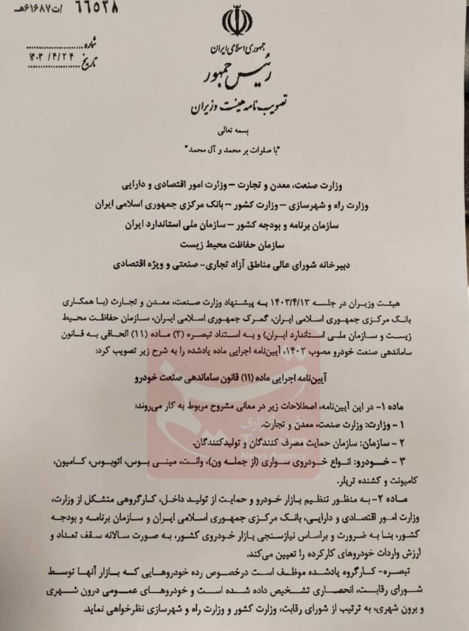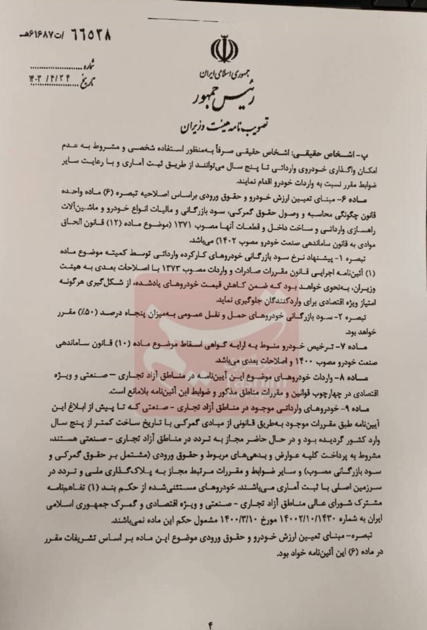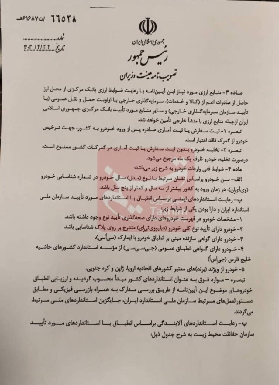 متن آیین نامه اجرایی واردات خودروهای کارکرده منتشر شد که بر اساس آن سن خودروها باید بین ۳ تا ۵ سال باشد و خودرو بدون ثبت سفارش اجازه ورود به گمرکات کشور را ندارد و در صورت وارد شدن مرجوع می‌شود.
