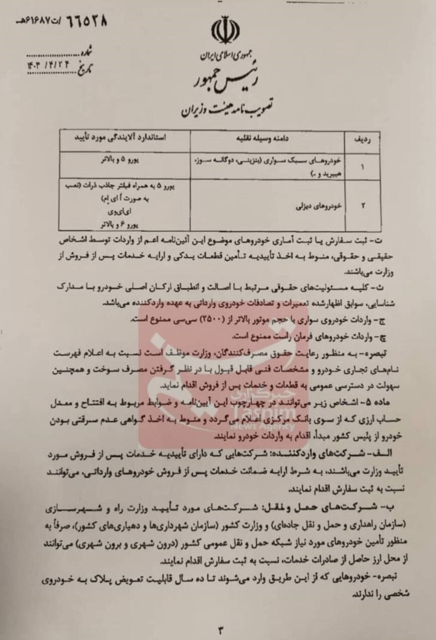 همچنین ترخیص خودرو منوط به ارائه گواهی اسقاط است و واردات خودرو با حجم موتور بالاتر از ۲۵۰۰ سی‌سی ممنوع است.