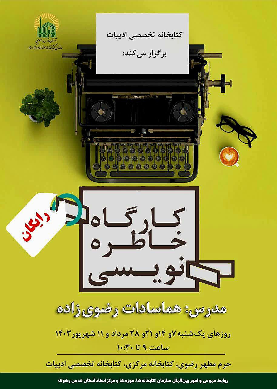 «کارگاه خاطره‌نویسی» با تدریس سرکار خانم هماسادات رضوی‌زاده برای همه علاقمندان فرهنگ و ادب بصورت رایگان در محل حرم مطهر رضوی، کتابخانه مرکزی، کتابخانه تخصصی ادبیات برگزار خواهد شد.