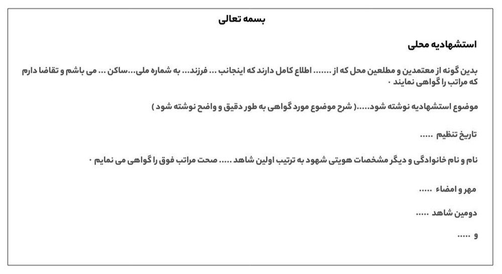 یک نمونه متن از استشهادیه محلی برای دادگاه بدین شرح می باشد: