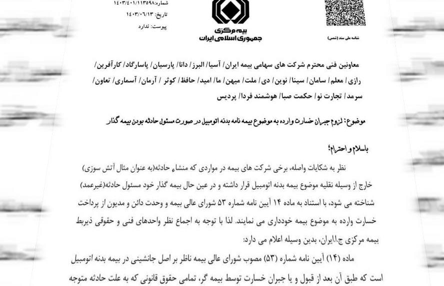 در این نامه که خطاب به معاونین فنی محترم شرکتهای سهامی بیمه: ایران، آسیا، البرز، دانا، پارسیان، پاسارگاد، کارآفرین، رازی، معلم، سامان، سینا، نوین، دی، ملت، میهن، ما، امید، حافظ، کوثر، آرمان، آسماری، تعاون، سرمد، تجارت نو، حکمت صبا، هوشمند فردا، پردیس صادر شده، بر لزوم جبران خسارت وارده به موضوع بیمهنامه بدنه اتومبیل در صورت مسئول حادثه بودن بیمهگذار تأکید گردید.