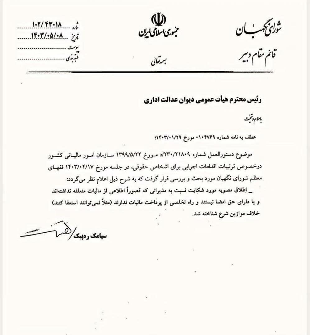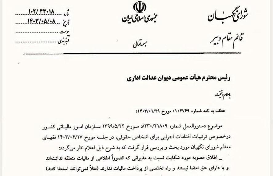 به گزارش آسیانیوز؛ مطابق نظریه اخیر شورای نگهبان که به دیوان عدالت اداری ابلاغ شد، مطالبه مالیات از مدیرانی که از مالیات متعلقه بیاطلاع بودهاند، به ویژه مدیران بدون حق امضا و کسانی که امکان استعفا از سمت خود را نداشتهاند، مغایر با موازین شرعی اعلام شده است. این اعلامیه پس از بررسیهای متعدد در شورای نگهبان صادر شده و هدف آن جلوگیری از تضییع حقوق مدیرانی است که به دلایل مختلف نتوانستهاند از مالیاتهای مورد نظر مطلع شوند یا تأثیر مستقیم بر تصمیمات مالی شرکت نداشتهاند.