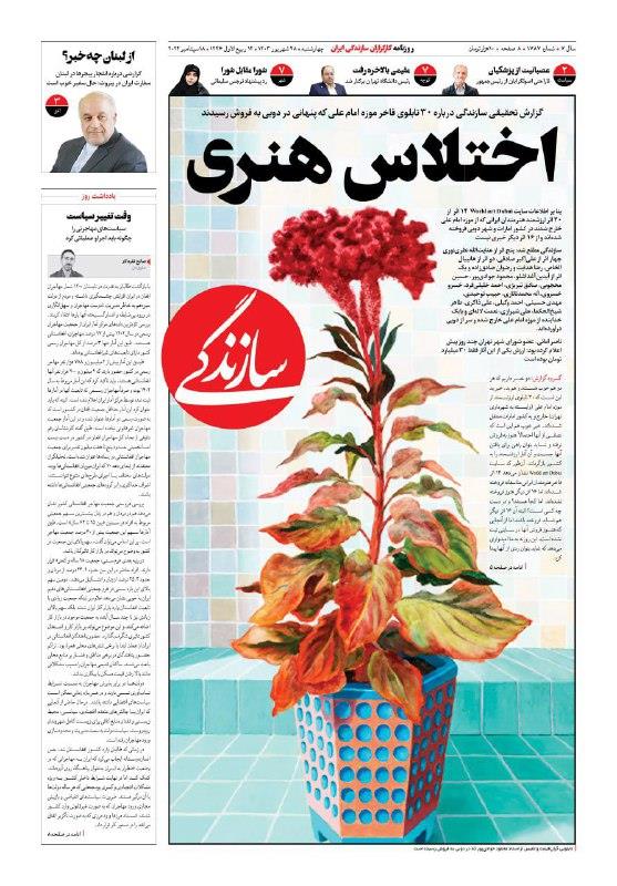 تصویر یک روزنامه سازندگی، یکی از آثار گرانقیمت و فاخر مرحوم استاد محمود جوادیپور است که جزو این ۳۰ اثر خارج شده از کشور است.