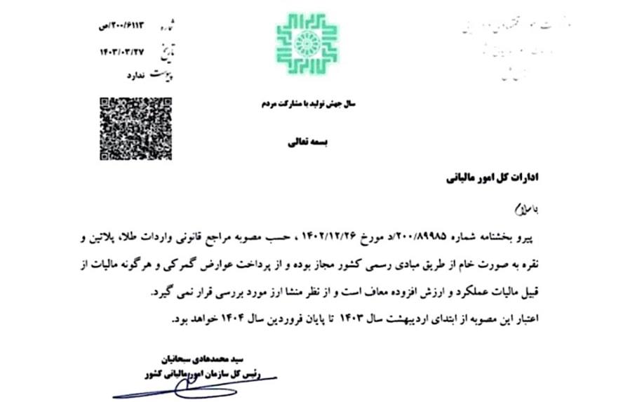 به گزارش آسیانیوز ایران؛ طبق بخشنامه صادره به شماره ۱۸۸۸۵ مورخ ۱۴۰۳/۰۶/۲۶ از سوی سازمان امور مالیاتی کشور، واردات طلا، پلاتین و نقره از طریق مبادی رسمی تا پایان فروردین ۱۴۰۴ از پرداخت هر گونه عوارض گمرکی و مالیاتهای مختلف، شامل مالیات عملکرد و مالیات بر ارزش افزوده، معاف است. این اقدام به منظور کاهش هزینههای واردات و تشویق بیشتر تجار برای واردات این فلزات گرانبها صورت گرفته است. همچنین، واردات این کالاها تا پایان تاریخ تعیینشده از نظر منشأ ارز مورد بررسی قرار نخواهد گرفت.
