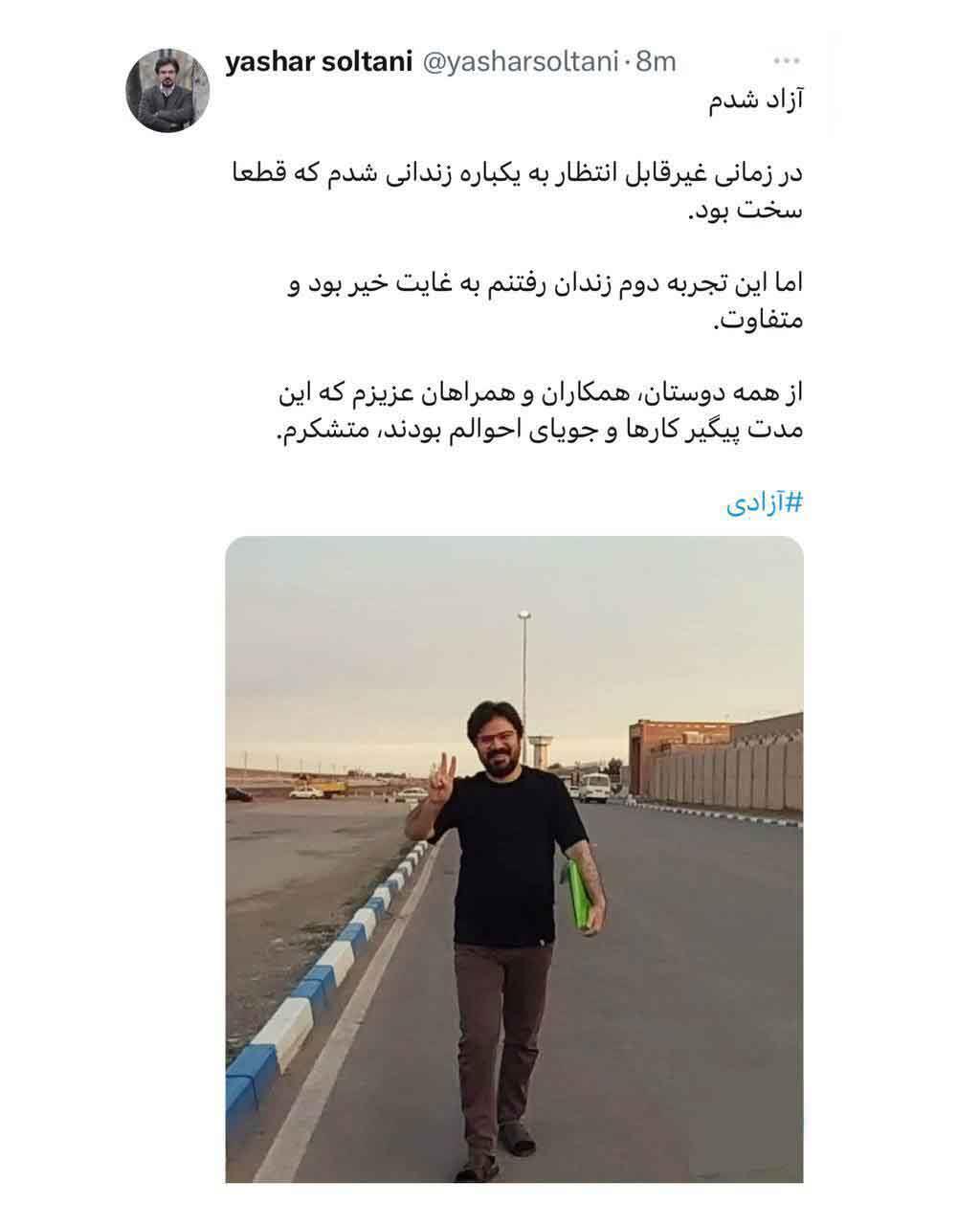 یاشار سلطانی، روزنامه‌نگار شناخته‌شده ایرانی و مدیرمسئول وبگاه معماری نیوز، پس از گذراندن چند ماه در زندان تهران بزرگ و پذیرش درخواست اعاده دادرسی در دیوان عالی کشور، آزاد شد. وی با انتشار پیامی در شبکه اجتماعی ایکس (توئیتر سابق) از این آزادی خبر داد و این تجربه زندان را «به غایت خیر» توصیف کرد.