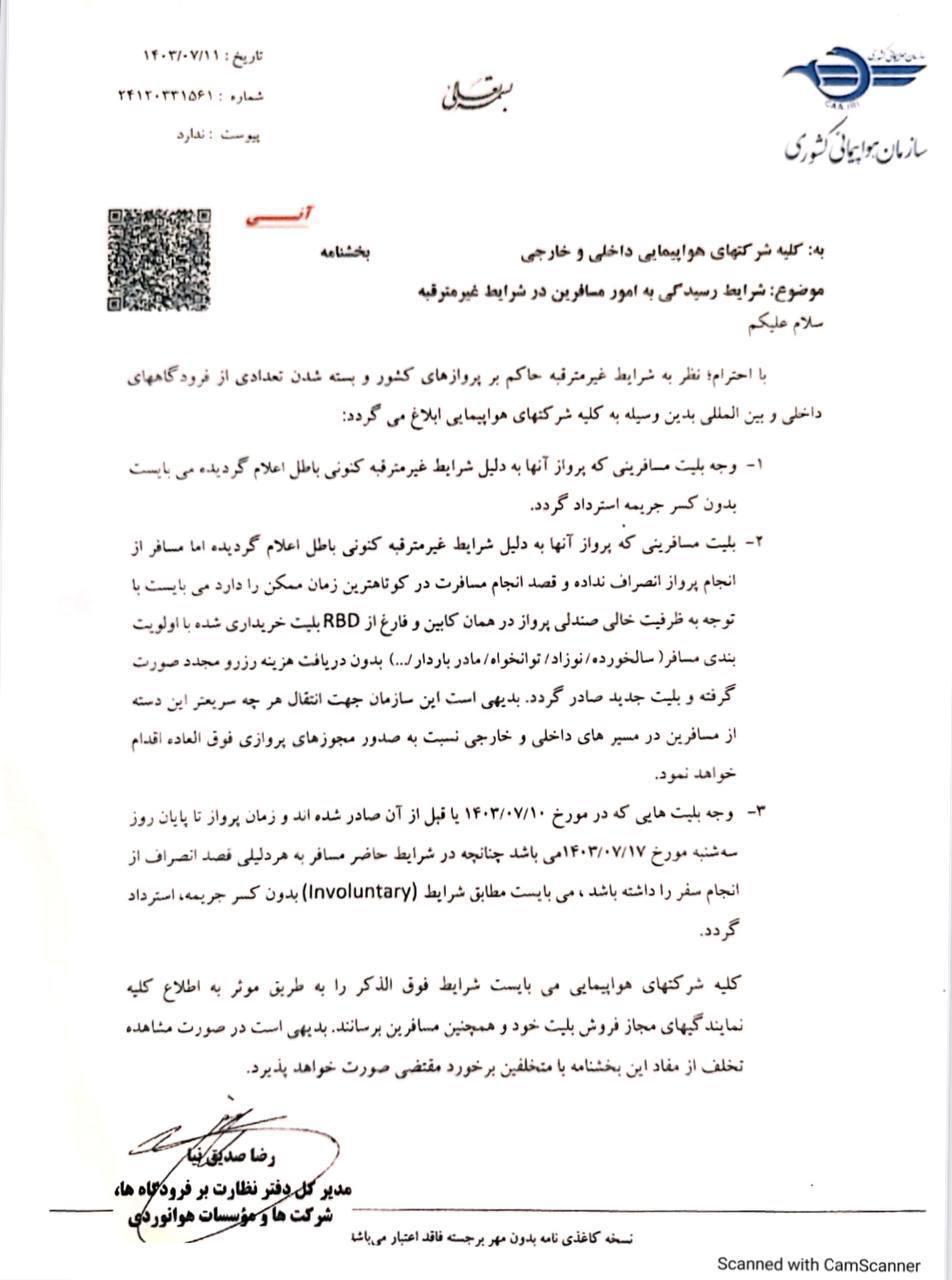 این بخشنامه شامل تمامی بلیتهایی است که تا تاریخ ۱۰ مهر ۱۴۰۳ صادر شدهاند و پروازهایشان تا ۱۷ مهر ۱۴۰۳ برنامهریزی شده است. همچنین شرکتهای هواپیمایی موظفاند این اطلاعات را بهطور مؤثر به نمایندگیهای خود و مسافران اطلاع دهند. در صورت مشاهده تخلف از مفاد این بخشنامه، با متخلفان برخورد قانونی خواهد شد.