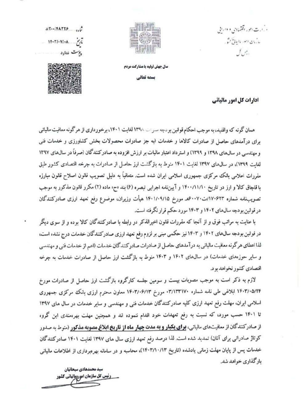 بر اساس اطلاعیه‌ای جدید از سوی سازمان امور مالیاتی کشور، صادرات خدمات فنی و مهندسی و سایر خدمات در سال‌های ۱۴۰۲ و ۱۴۰۳ نیازی به رفع تعهد ارزی نخواهد داشت. همچنین صادرکنندگان خدمات برای رفع تعهدات ارزی سال‌های ۱۳۹۷ تا ۱۴۰۱ تا تاریخ ۱۳ دی‌ماه ۱۴۰۳ فرصت دارند.