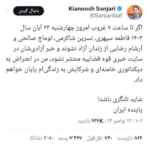 درگذشت فعال سیاسی و حقوق بشری در تهرانتصویر پیام کیانوش سنجری در شبکه ایکس
