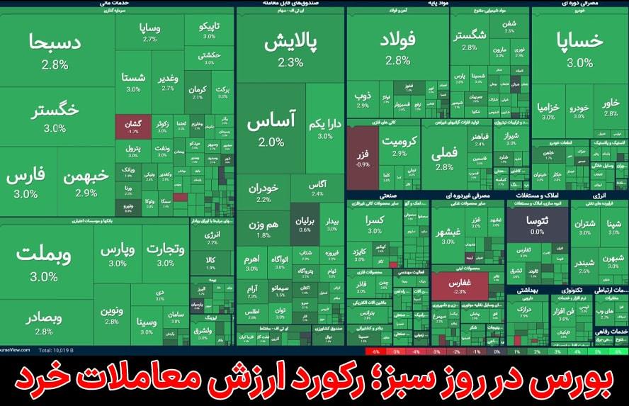 شاخص کل نیز تحت تأثیر رشد مثبت صنایع بزرگ، افزایش قابلتوجهی را تجربه کرد. نقشه بازار نشان میدهد که سبزپوشی بازار در اکثر گروهها مشهود بود و فقط تعداد کمی از نمادها مانند "فزر" عملکرد منفی داشتند.
