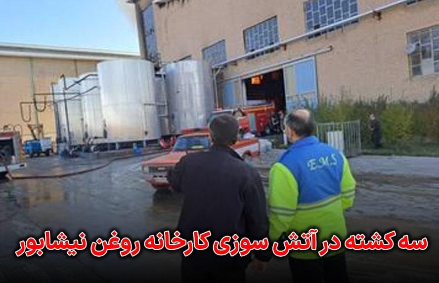 آتش‌سوزی سنگین و انفجار در یکی از سوله‌های کارخانه تولید روغن نباتی در نیشابور، منجر به جان‌باختن سه نفر و مصدومیت یک نفر دیگر شد. آتش‌نشانان پس از چند ساعت تلاش موفق به مهار آتش شدند و عملیات بررسی علت حادثه همچنان ادامه دارد.