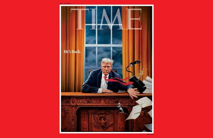 مجله تایم در طرح جلد جدید خود به مناسبت آغاز دوباره ریاست‌جمهوری دونالد ترامپ، بازگشت او به قدرت را با عبارت «او برگشت» برجسته کرده است.