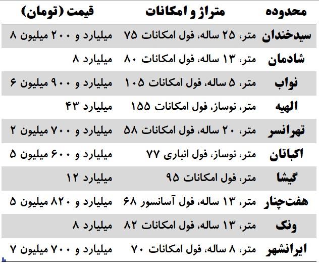 بر اساس آخرین گزارشها، قیمت مسکن در برخی از مناطق تهران به شرح زیر است: